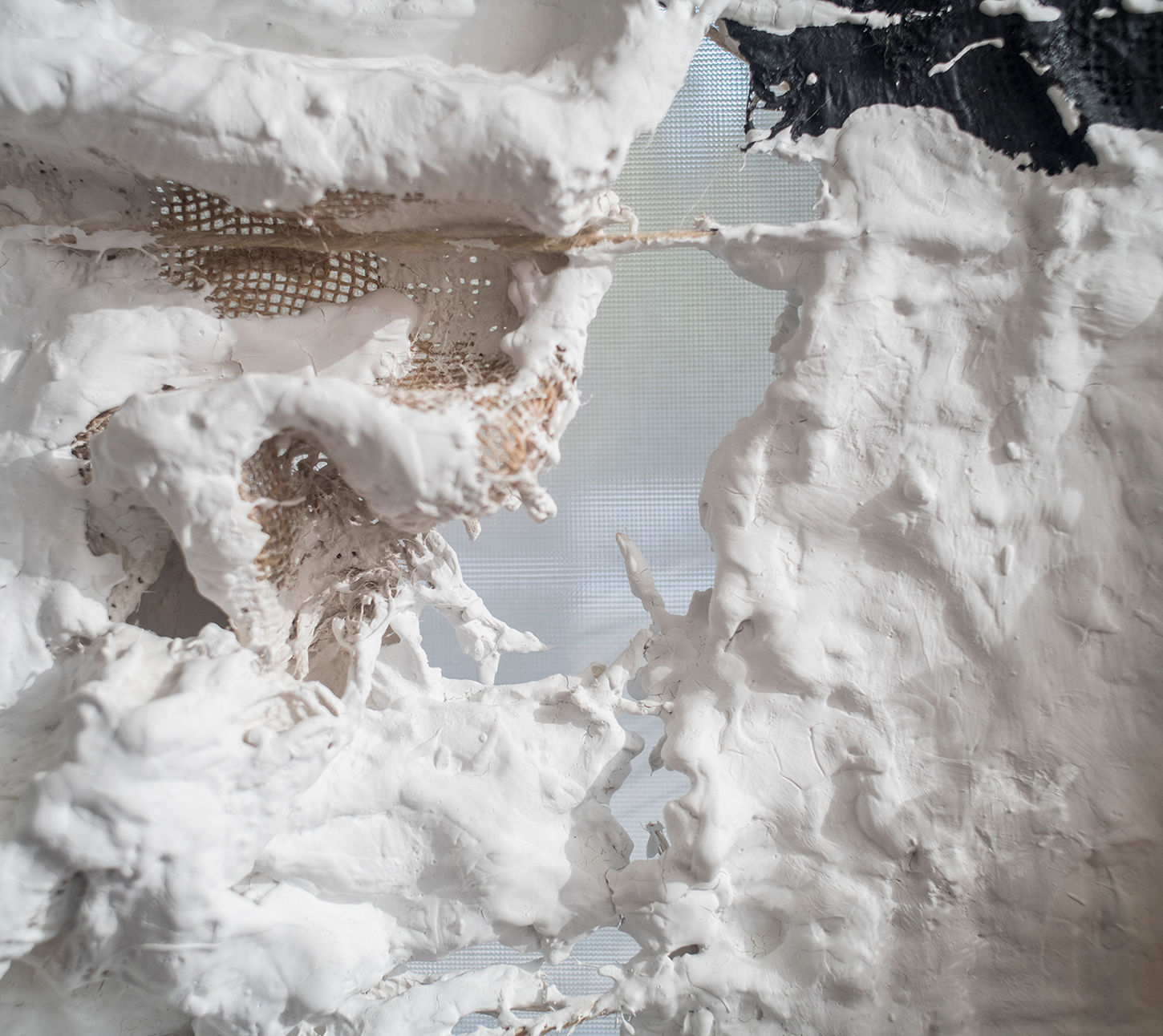 Last year there was illness, death, depression, suicide, and heartbreak. Black filled these paintings. Openings of hurt became larger and ropes rolled up the edges of burlap in anger and despair. Winter came and a layer of white snow silence alleviated the pain, softening the hurt. With the spring, a few burlap flowers appeared filling up the holes of pain. A few bright splashes of gold bringing back life. A rebirth through art. And a love that is stronger than death. Burlap Flowers emerge from a dead landscape as a symbol of life growing and love enduring. On spiritual salvation through art.